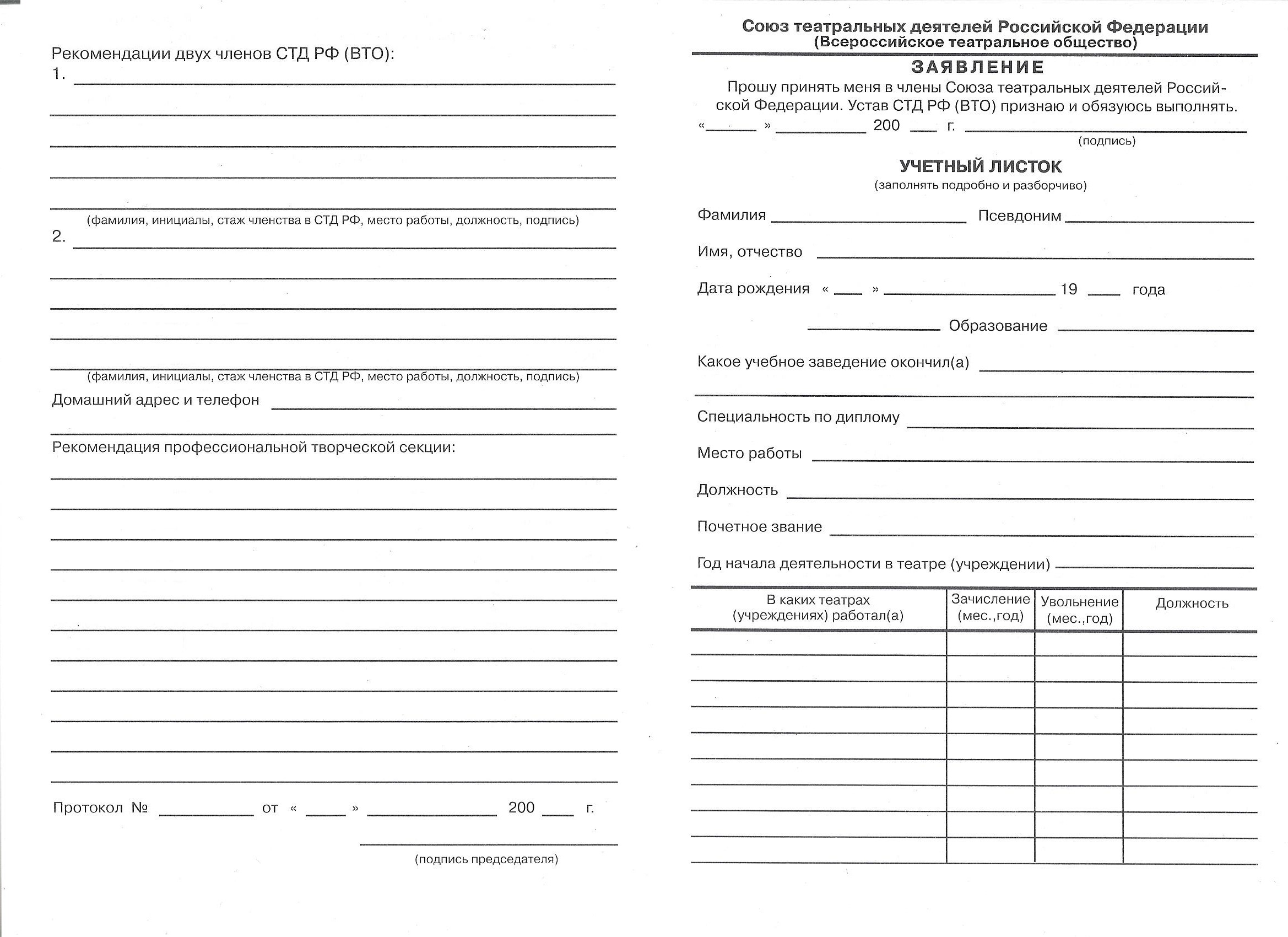 1. Заявление (учетный листок), с двумя рекомендациями членов СТД РФ
