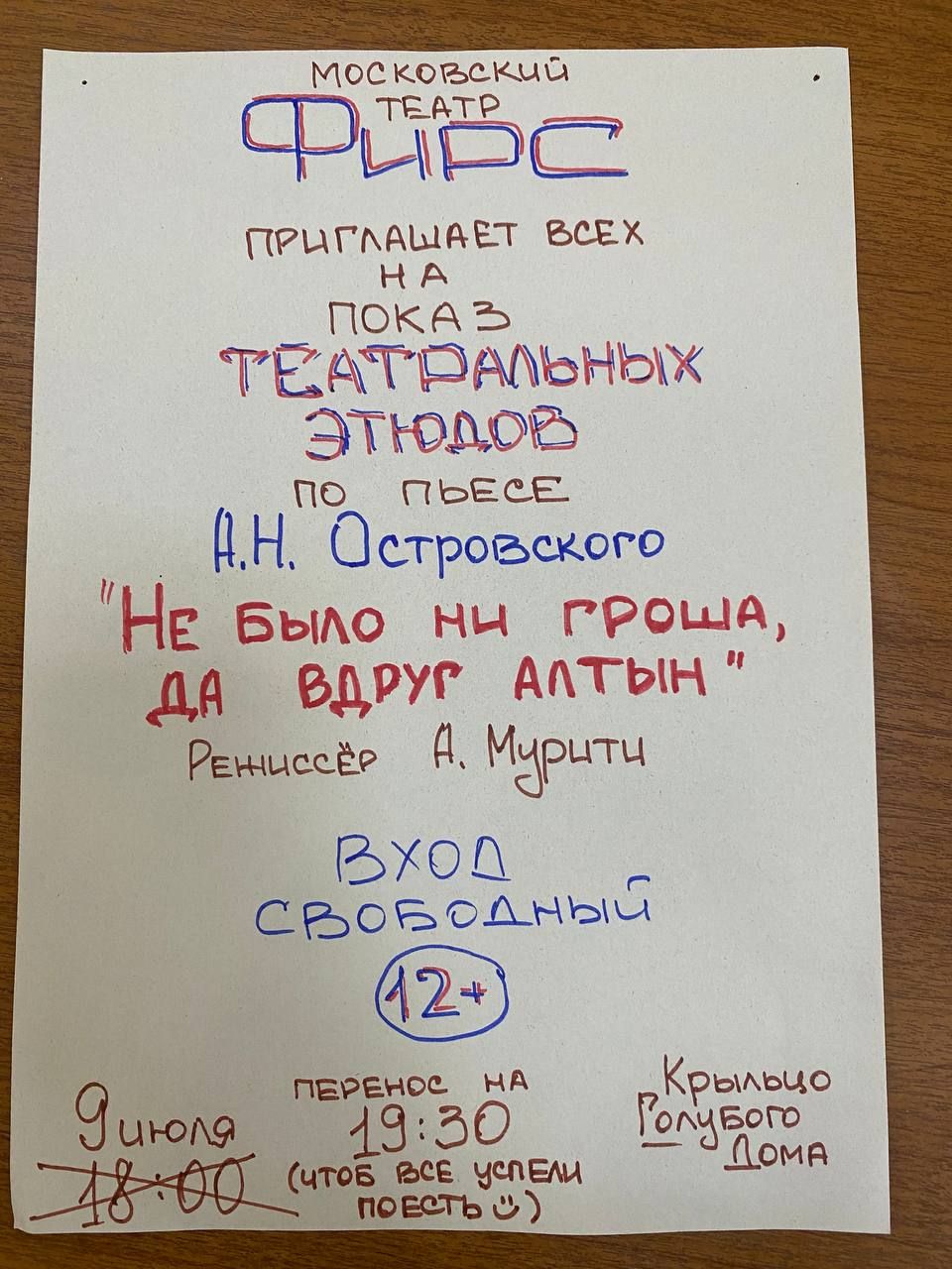 • 9.07 прошёл показ театральных этюдов по пьесе А.Н.Островского «Не было ни гроша, да вдруг алтын» в исполнении Московского театра «Фирс».